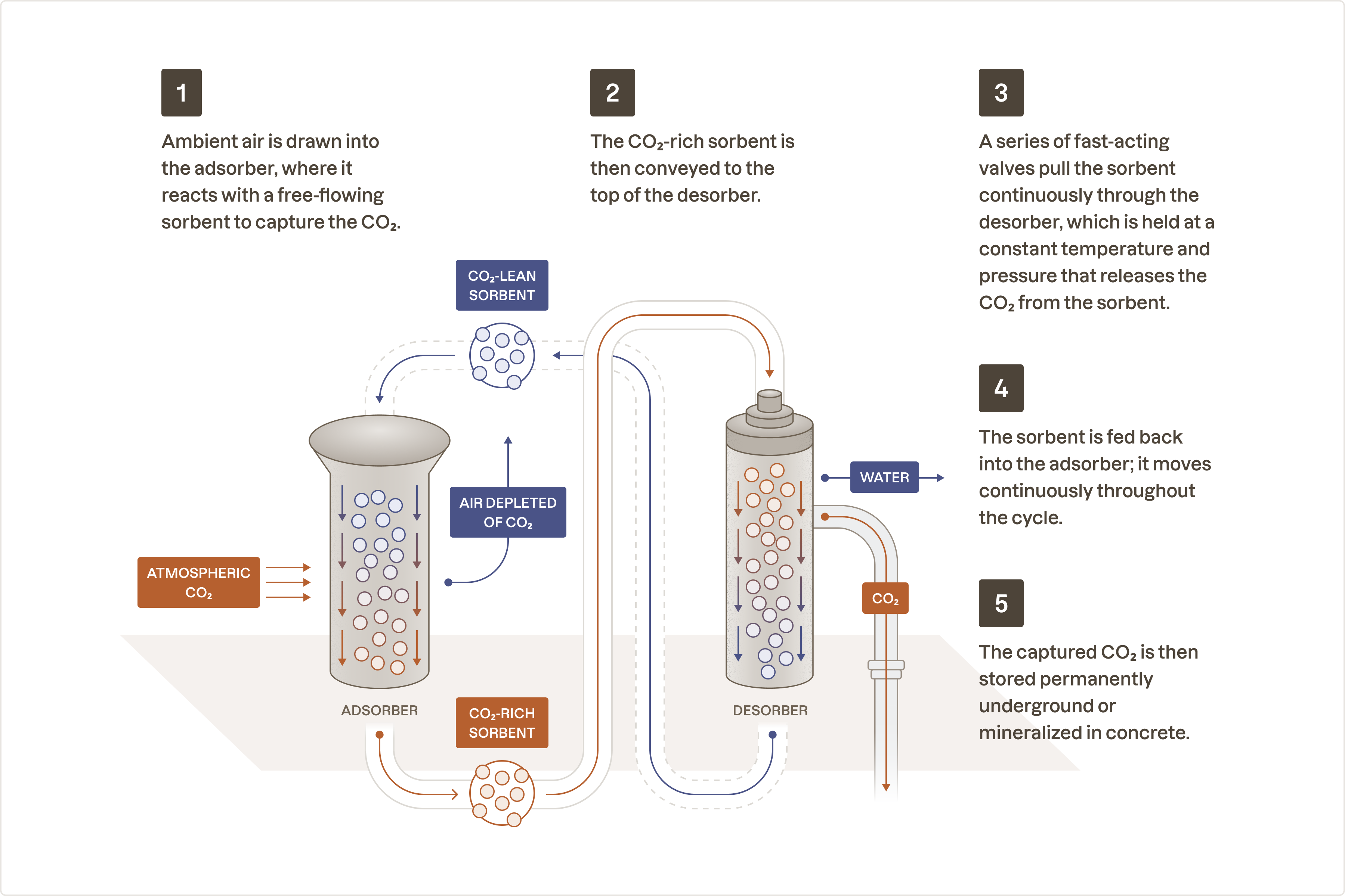 280 Earth was originally launched in 2018 at X, the moonshot factory founded by Google, and spun out in 2022. They are working toward driving down the cost curve for DAC with an approach that minimizes both capital and operating costs. Their system works continuously by pulling air into contact with a proprietary sorbent developed by the 280 Earth team that captures the CO₂. The CO₂-rich sorbent is conveyed to a vacuum chamber that is kept at a constant temperature and pressure, where it releases the CO₂. The pure stream of CO₂ can then be permanently stored underground or mineralized in concrete.
