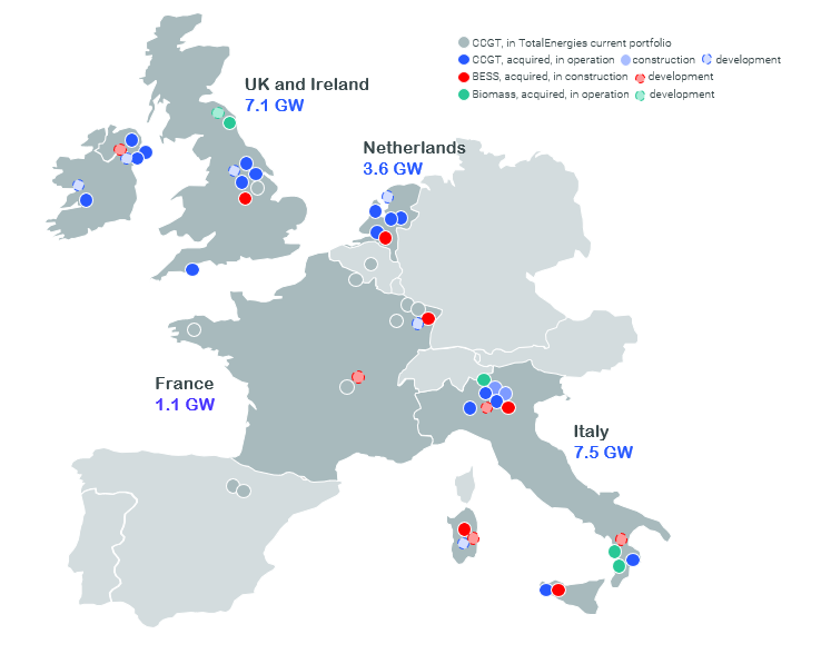 The transaction covers a portfolio of more than 14 GW gross capacity of flexible generation assets in operation or under construction. This primarily includes gas-fired power plants, biomass power plants and battery systems, which benefit from secured capacity revenues representing 40% of the gross margin, allowing TotalEnergies to strengthen its presence in the most profitable European electricity markets:Italy: 7.5 GW, with 3.7 GW in operation, 2.4 GW under construction, including two next-generation gas-fired power plants that are among the most efficient in Europe, and 1.4 GW under development.
